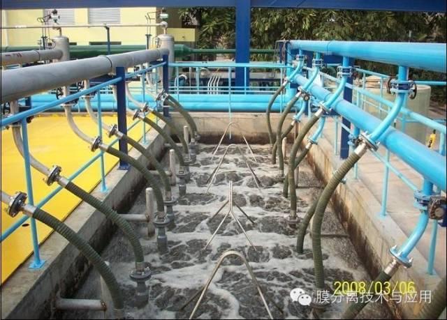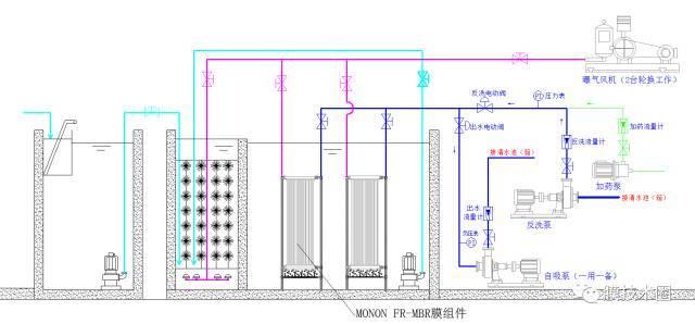 A(2A)O-MBR工艺是两段缺氧A2O工艺与MBR工艺的结合,其特点是在传统的A2O工艺中设置了两段缺氧区(缺氧区Ⅰ和缺氧区Ⅱ),在缺氧区内从好氧区回流的NO3-完全被还原,实现完全反硝化;而在第二缺氧区内实现内源反硝化,节省外加碳源的投加,则可大大提高污水的生物脱氮效率,同时避免了外加碳源,节约运行费用,因此具有很高的价值,下图为在MBR膜池内的高抗污染FR-MBR膜组件。
