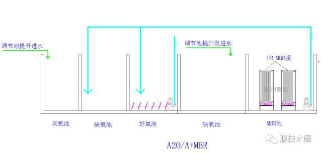 AO或者 A2O及其变形强化工艺是众多应用在MBR脱氮除磷工艺中处理效果较为突出,运行管理较为方便,也是较稳定可靠的一类。以下将介绍多种形式的MBR脱氮除磷组合工艺。