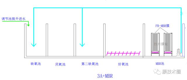 该工艺的内部流程依次是缺氧池、厌氧池、第二缺氧池、好氧池和膜池,膜池混合液分别回流至缺氧池和第二缺氧池。3A-MBR工艺合理地组合了有机物降解和脱氮除磷等各处理单元,协调了各种生物降解功能的发挥,达到了同步去除各污染指标的目的,具有较高的推广应用价值。