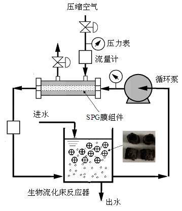 MAFBR 反应器实验装置图如图 1 所示。采用SPG膜进行微气泡曝气,SPG 膜为管式疏水膜,膜孔径为 0.8 μm,膜面积为 1.57×10 -3 m 2 。采用循环泵使得反应器内混合液在 SPG 膜管内循环流动,利用空气压缩机在 SPG 膜管外提供压缩空气 (0.6~0.8MPa),空气通过膜孔进入管内,在循环液体水力剪切作用下形成微气泡。通过调节跨膜压差控制空气通量及溶解氧(DO)浓度。实验条件下所产生的微气泡的平均直径范围为 30~40 μm。