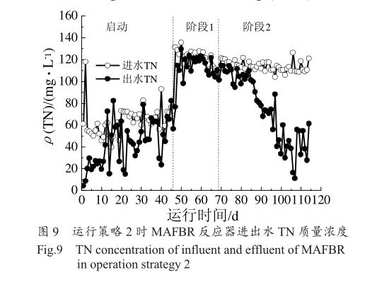 运行策略 2 时,MAFBR 反应器进出水 TN 质量浓度变化如图 9 所示,其中阶段 1 和阶段 2 进水TN 质量浓度同样比启动阶段提高约 1 倍,降低 C/N比为 1.0??梢钥吹?,启动运行 15 d 后,启动、阶段 1和阶段 2 出水 TN 质量浓度分别为 50.70、113.46、74.47 mg/L;去除率分别为 22.63%、6.97%、34.64%;去除负荷分别为 0.06、0.03、0.16 kg/(m 3 ·d)。同样值得注意的是,阶段 2 运行至 98 d 后,TN 去除性能明显改善,出水 TN 平均质量浓度、去除率和去除负荷分别为 40.43 mg/L、63.93%和 0.29 kg/(m 3 ·d)。