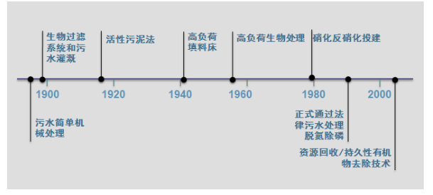 从1900年开始到现在,污水处理经过了生物过滤系统和污水灌溉阶段,到活性污泥阶段,经过长时间的发展和完善,到现在的资源回收/持久性有机物去除技术。